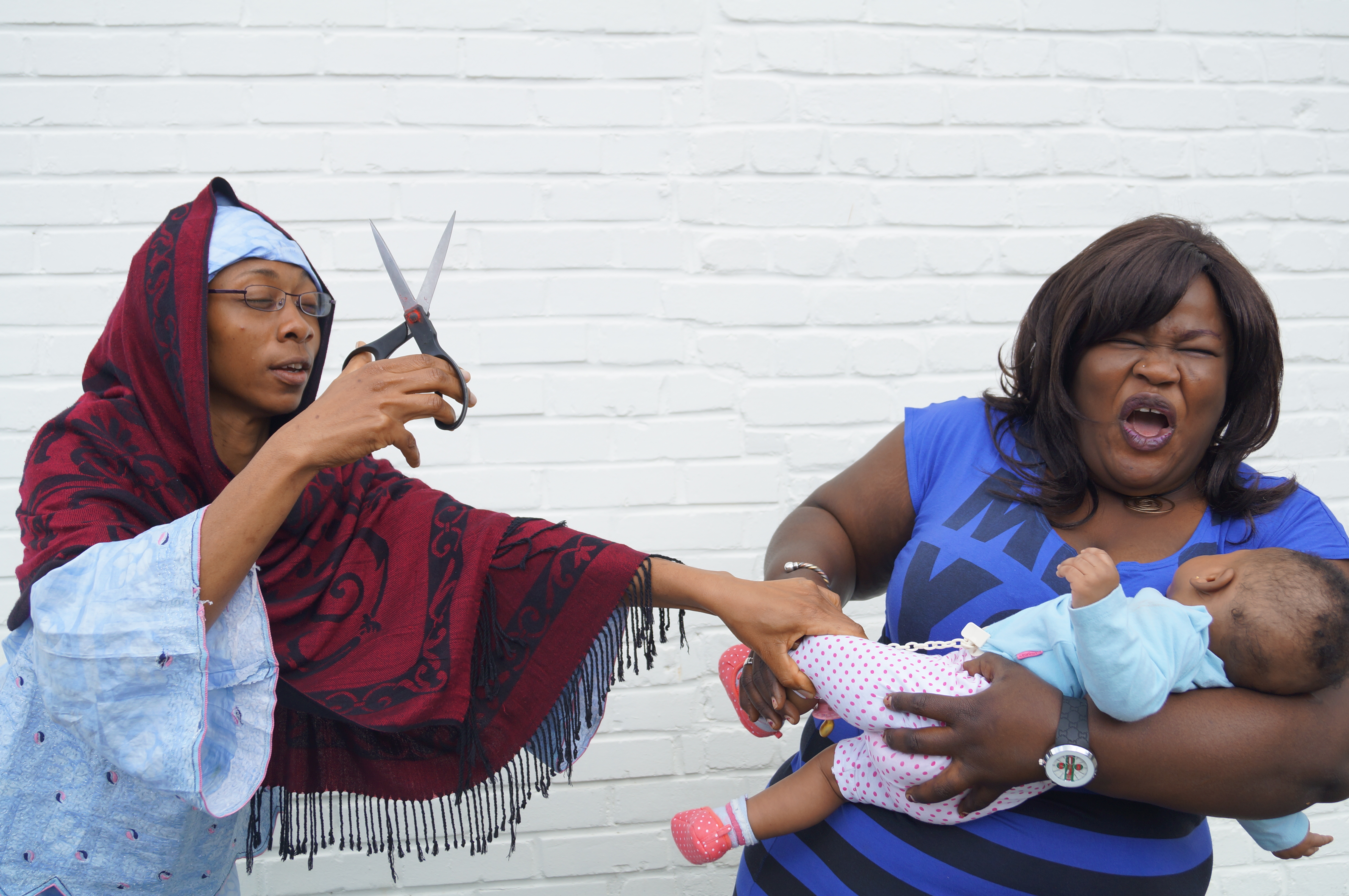 Si on prend des ciseaux, dès que tu les ouvres, ça devient une croix. Nous tous, dès que tu vois quelque part cette croix comme ça, tu sais que c’est quelque chose d’interdit. Donc, les ciseaux montrent la croix. Sur les ciseaux, il y a un cercle rouge au milieu. J’ai mis un foulard rouge. Le rouge, dans mes idées, représente le sang. J’ai emprunté un bébé qui est une fille. Sur l’affiche, j’essaie d’attraper ce bébé. Je représente ainsi une exciseuse qui va exciser la fille. Mais, la maman de la fille refuse que je l’excise. Parce que ce n’est pas bon. Elle déjà, elle sait que ce n’est pas bon. Mais moi, comme c’est mon travail, je tiens à le faire. Pour moi, cela veut dire à toutes les femmes exciseuses d’arrêter. Certains membres de la famille prennent les enfants de force, sans l’accord de leur parent. Sur l’affiche, la maman de l’enfant a montré qu’elle n’avait pas peur : sa fille ne va pas être excisée. Elle tient sa fille. Elle ne part pas. L’exciseuse ne peut rien faire, parce que la mère tient sa fille. Sur l’affiche, la croix formée par les ciseaux ouverts signifient : STOP !